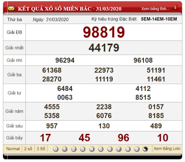Dựa vào bảng kết quả xổ số của thứ 4 ngày 31/03/2020 các bạn thấy ở giải nhất có kết quả là 44179. Tiến hành tính tổng của kết quả này sẽ được 25. Như vậy các bạn sẽ lựa chọn con 25 để làm bạch thủ lô cho thứ 2 đến thứ 6 của tuần sau. Các bạn cũng có thể nuôi dạng lô lộn 25 – 52 để cơ hội chiến thắng cao hơn.